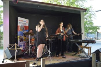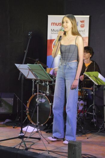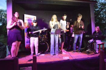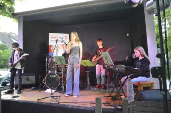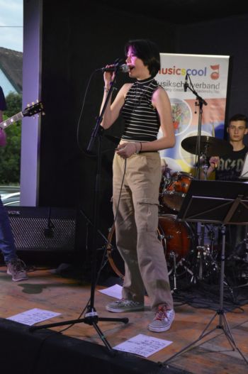 Beim allerschönstem Sommerwetter waren zahlreiche Zuhörer gekommen, um das Können der jungen und der ganz jungen Bandmitglieder sowie ihren jung gebliebenen Lehrern Dietmar Winkler und Carl-Michael Bart zu bestaunen. Es wurde auf der Bühne so richtig gerockt und mit Lena Zöttl und ihren eigens geschrieben Songs gab es zwischendurch auch mal etwas ruhigere Töne. beim großen Finale mit „I love Rock’n’Roll“ standen dann alle Musiker*innen auf der Bühne und bereiteten dem tollen Abend einen würdigen Abschluss.